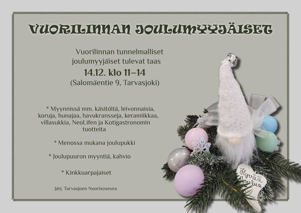 - Joulumyyjäiset 14.12. klo 11-14 Vuorilinnassa. Myyntipaikkatiedustelut maika.timonen@gmail.com.